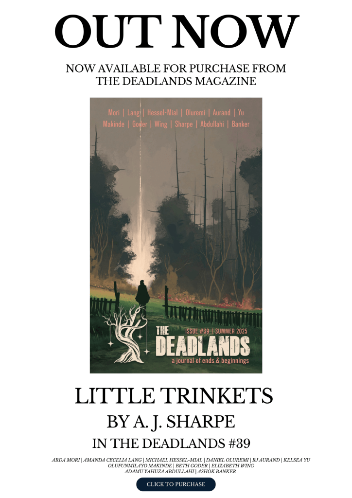 ABOUT A. J. Sharpe, queer horror author and a collector of dead things, has always enjoyed the morbid and the gross. Armed with a MA degree in Creative Writing from Aberystwyth University, Sharpe hopes to use her skills to horrify and nauseate.