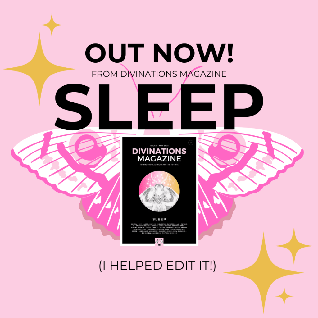 Wakey, wakey, rise and shine–Issue 5 of Divinations Magazine has arrived! We’ve got twenty pieces by twenty lovely writers in this issue, full of sleep-inspired horror. As you’ll see, there’s a variety of stuff in here, including ghosts and strange clawed creatures.